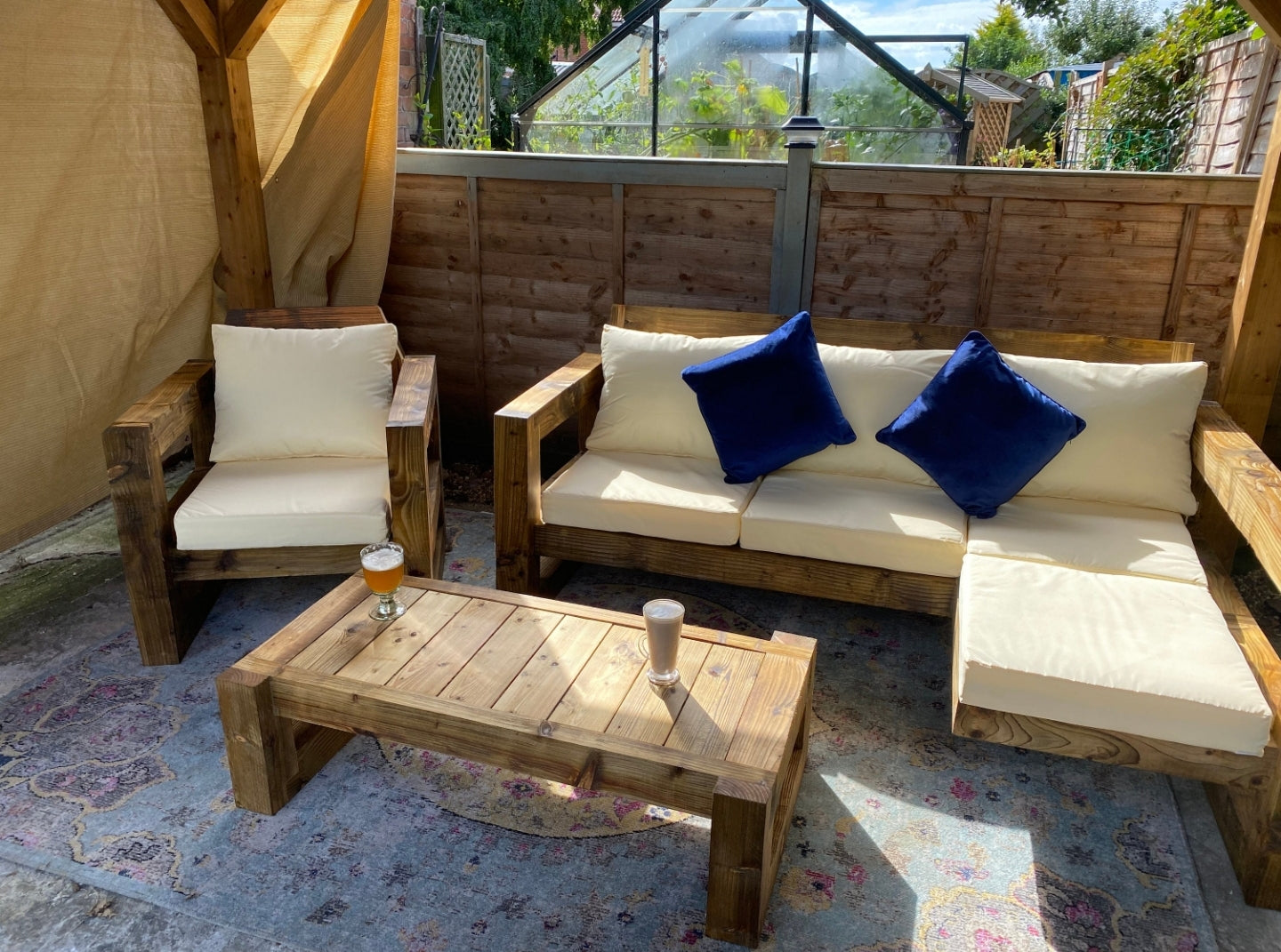 A Full handmade to order Garden Furniture Set Comprising of a 3 Seater Corner Sofa and a Side/coffee Table that Doubles as a bench (with the premium supplied outdoor cushions of course). And a single armchair with cushions. The best part of all however is once you slot the bench into the Sofa, You have an amazing outdoor day bed for 3 to relax on! With everything being so chunky there's plenty of room on the chair arms to place your cold beverages! Why use the table for your drinks when it can be better suited to make up the perfect Garden Day Bed!