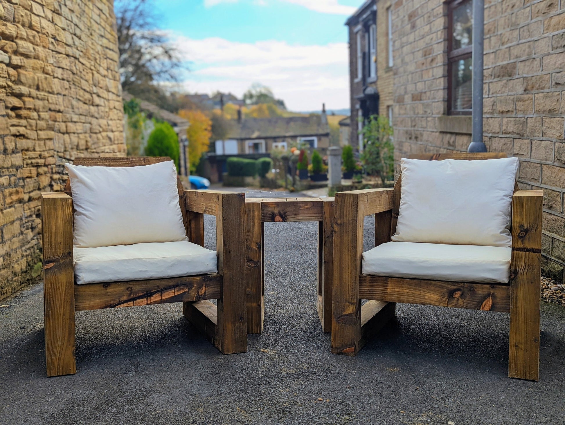 A set of handmade to order rustic Garden chairs built from Pressure Treated Timber that is 100mm x 100mm Thick. This is an incredibly Strong and Industrial Design. Designed using a series of rebate joints that uses the strength of the wood itself to provide rigidity. There are absolutely NO visible screws/Bolts for a simplistic and Minimalist effect. Also included, a side table built using the same design language as the chairs.