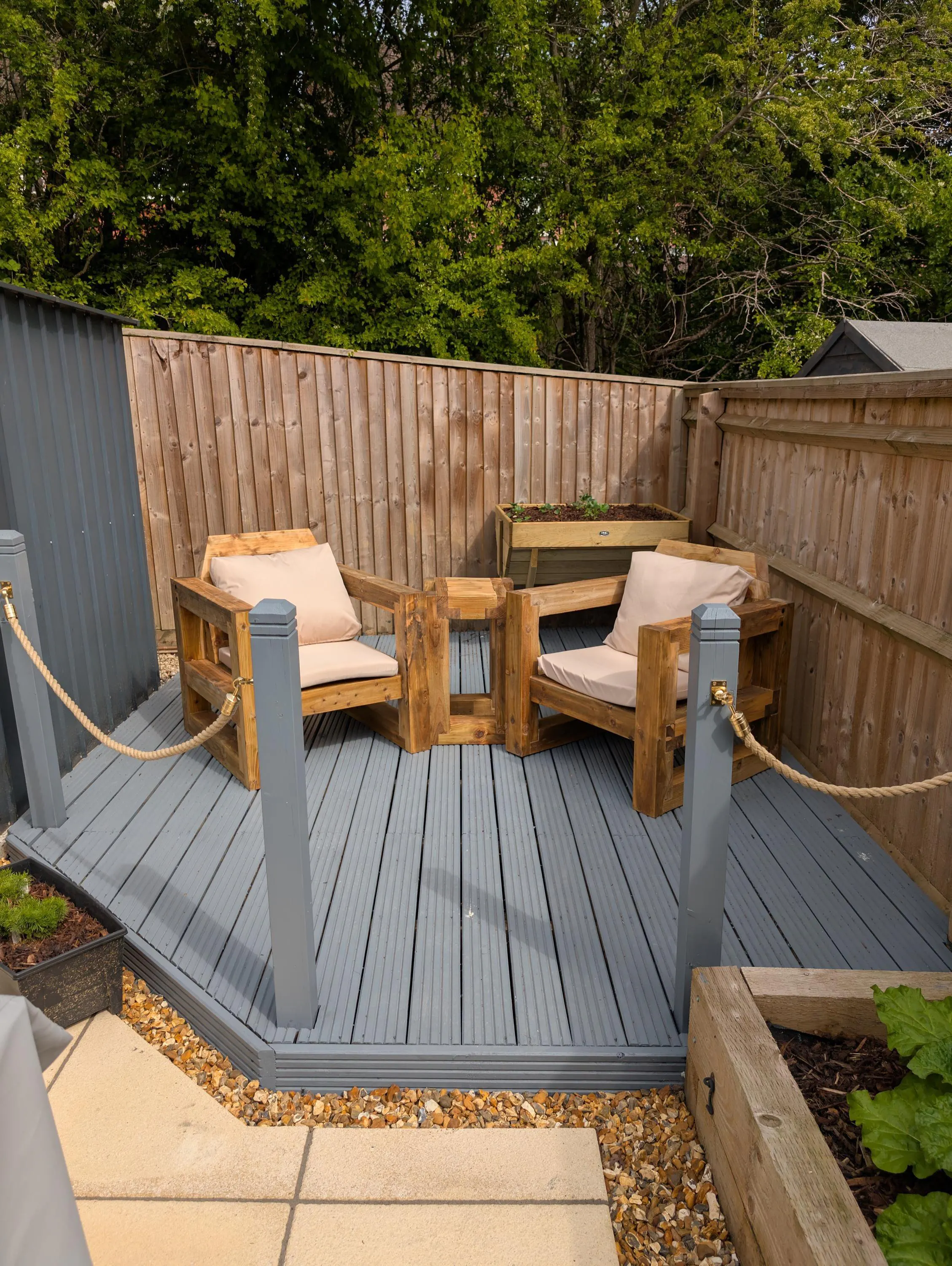 A set of handmade to order rustic Garden chairs built from Pressure Treated Timber that is 100mm x 100mm Thick. This is an incredibly Strong and Industrial Design. Designed using a series of rebate joints that uses the strength of the wood itself to provide rigidity. There are absolutely NO visible screws/Bolts for a simplistic and Minimalist effect. Also included, a side table built using the same design language as the chairs.