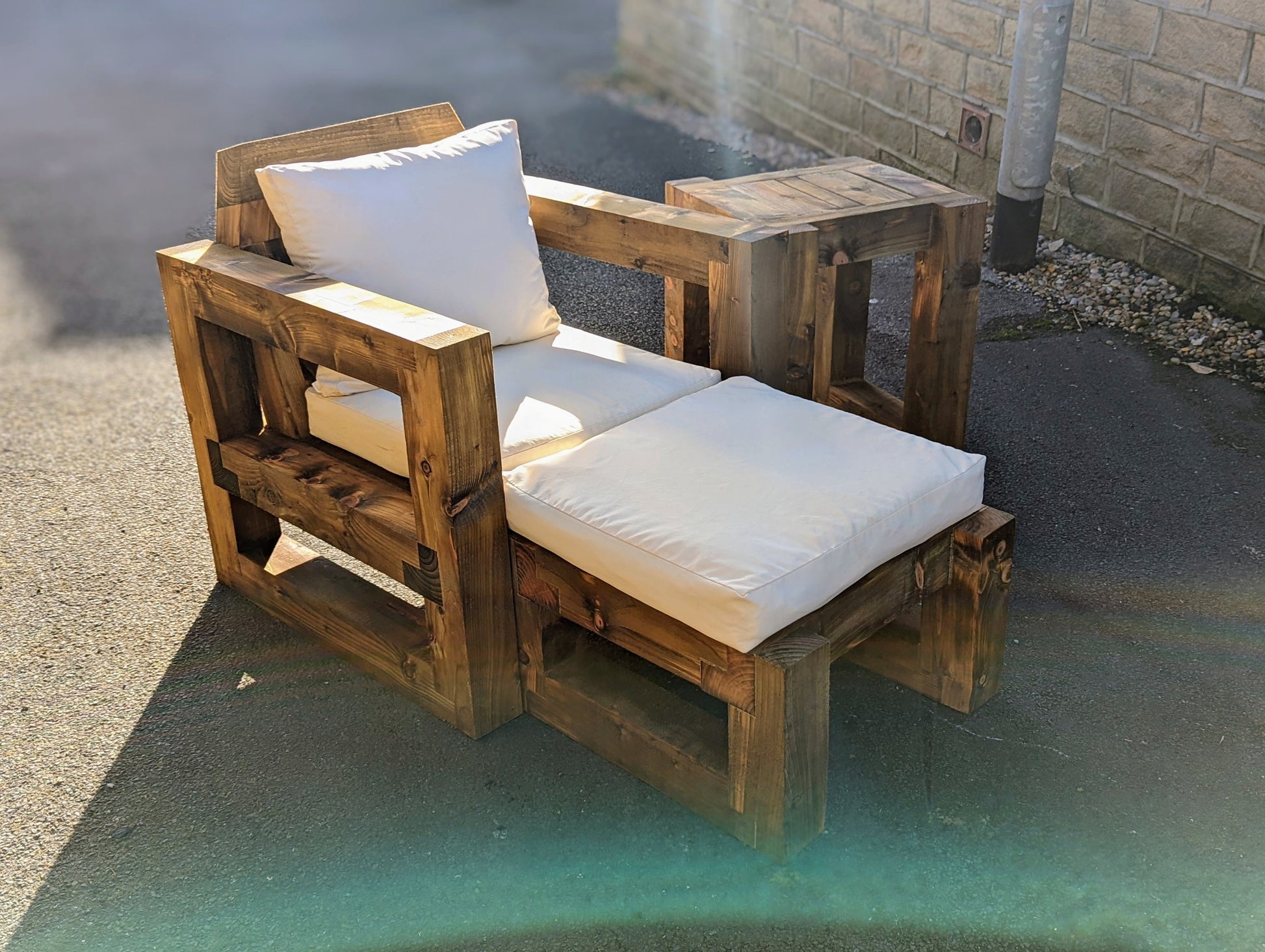 A handmade to order rustic Garden chair built from Pressure Treated Timber that is 100mm x 100mm Thick. This is an incredibly Strong and Industrial Design. Designed using a series of rebate joints that uses the strength of the wood itself to provide rigidity. There are absolutely NO visible screws/Bolts for a simplistic and Minimalist effect. Also included, a side table and ottoman / foot rest that can either be used to convert your chair into a sun lounger or simply used as a coffee table or even an extra stool if you have guests.