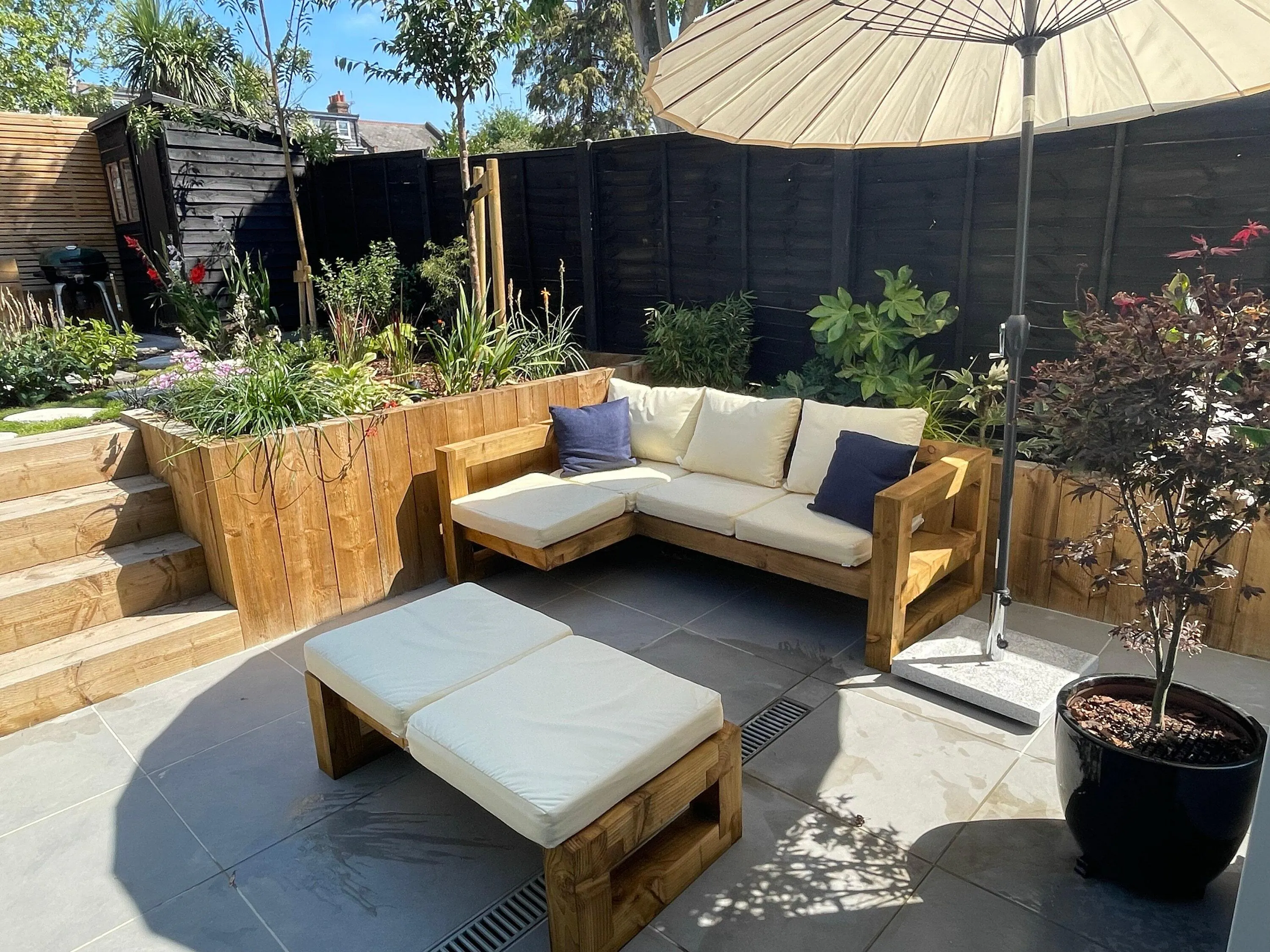 A Full handmade to order Garden Furniture Set Comprising of a 3 Seater Corner Sofa and a Side/coffee Table that Doubles as a bench (with the premium supplied outdoor cushions of course). The best part of all however is once you slot the bench into the Sofa, You have an amazing outdoor day bed for 3 to relax on! With everything being so chunky there's plenty of room on the chair arms to place your cold beverages! Why use the table for your drinks when it can be better suited to make up the perfect Garden Day Bed!