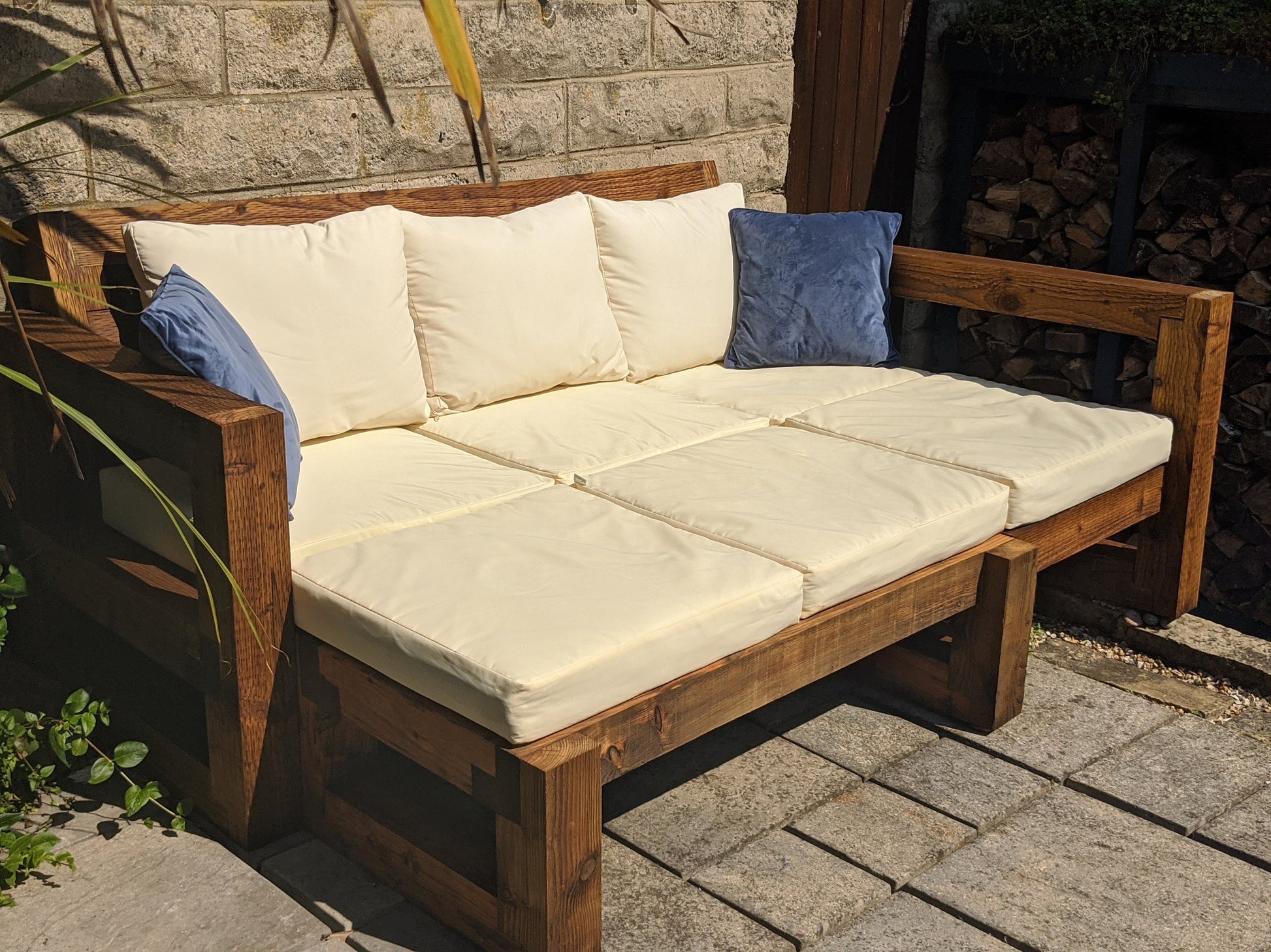 A Full handmade to order Garden Furniture Set Comprising of a 3 Seater Corner Sofa and a Side/coffee Table that Doubles as a bench (with the premium supplied outdoor cushions of course). The best part of all however is once you slot the bench into the Sofa, You have an amazing outdoor day bed for 3 to relax on! With everything being so chunky there's plenty of room on the chair arms to place your cold beverages! Why use the table for your drinks when it can be better suited to make up the perfect Garden Day Bed!