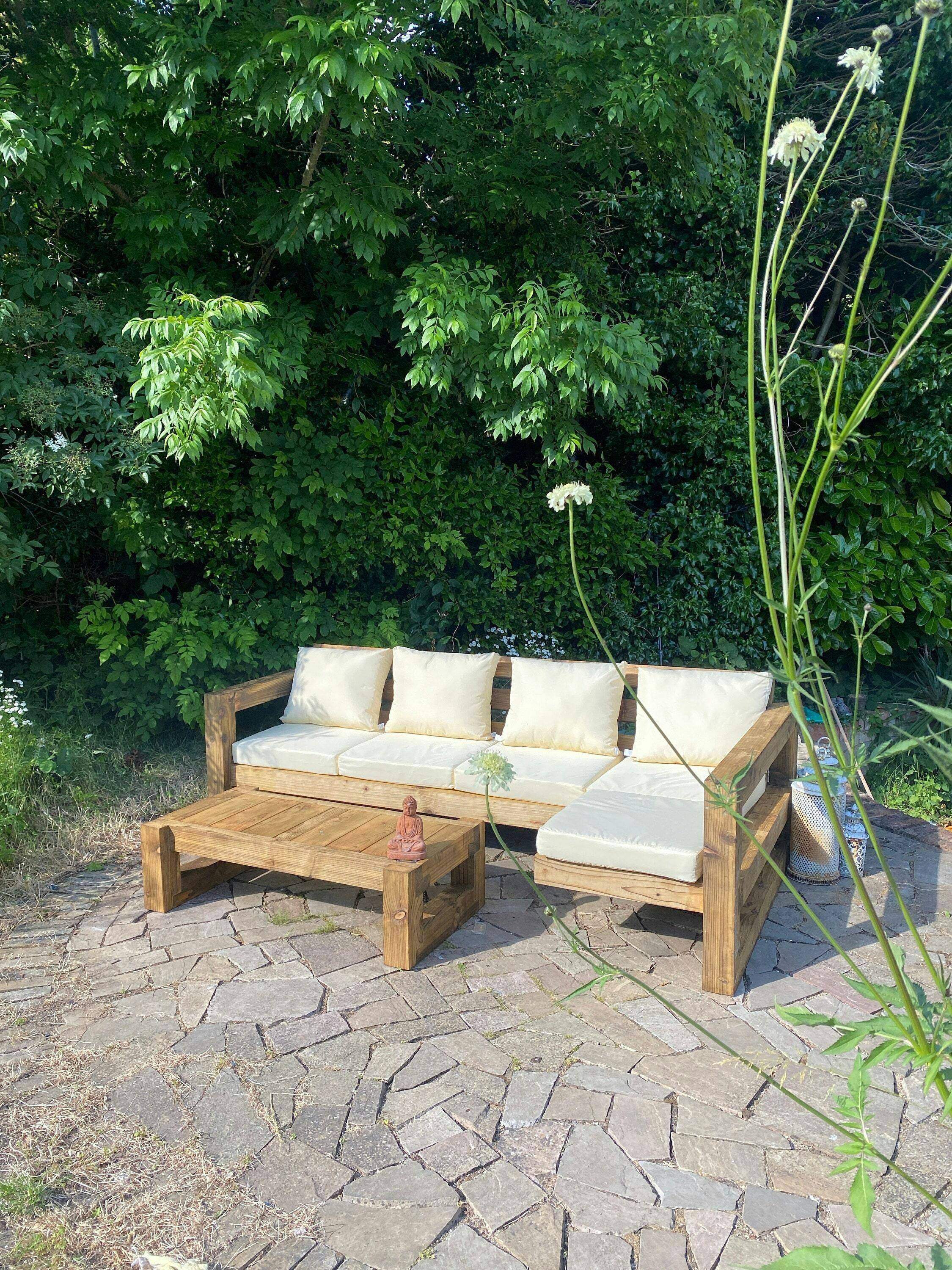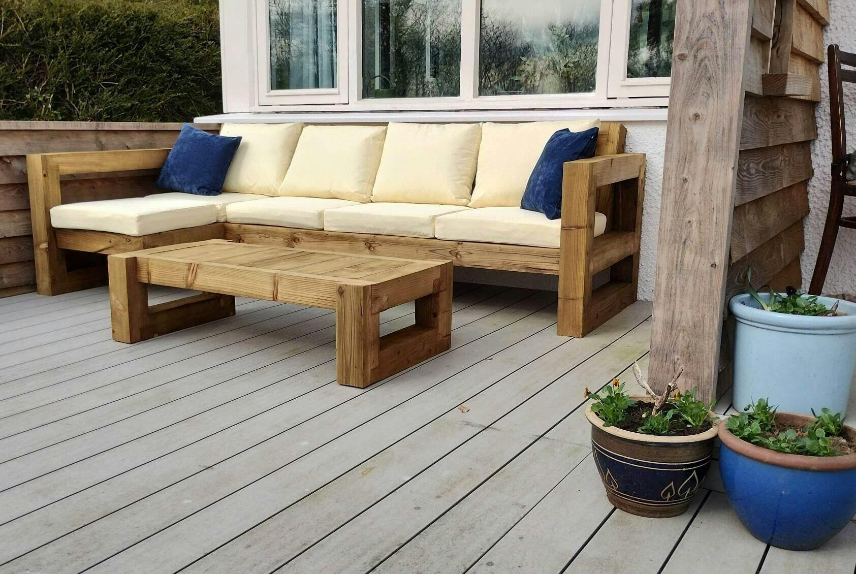 A handmade to order 4 seat rustic corner Sofa built from Pressure Treated Timber that is 100mm x 100mm Thick. This is an incredibly Strong and Industrial Design. Designed using a series of cantilevers and rebate joints that uses the strength of the wood itself to provide rigidity, this sofa even has a "floating" section that can support a fully grown adult. There are absolutely NO visible screws/Bolts for a simplistic and Minimalist effect.